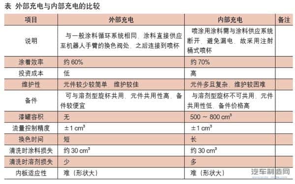 (1)外部充电方式(见图1) 该方式与内部充电的机器人系统相比,一次性投资金额少。但相比于内部充电(70%)而言,外部充电(60%)产生的涂料废液较多,这导致材料使用量增加,成本增高;涂装效率低;合格率下降;涂装设备脏污,外部污染严重(清扫频率高),喷枪主体和机器人污染严重,影响品质(易导致飞溅);喷房/分离槽污染严重等。
