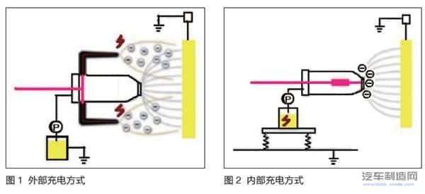 (3)外部充电方式 即由外部电极向喷出的涂料粒子增加电压,主要特征为间接加电导致损耗大、涂着效率低,在实际生产中有相关应用。
